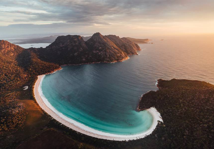 酒杯湾位于东海岸半岛的菲欣纳国家公园 Freycinet National Park,在 1999 年由美国旅游杂志《Outside》投选酒杯湾为世界十大海滩之一,评论如此描述:“沙滩与塔斯马海形成轮廓分明的半月形状,犹如‘祝君愉快’扣针纽上的笑脸一般……”